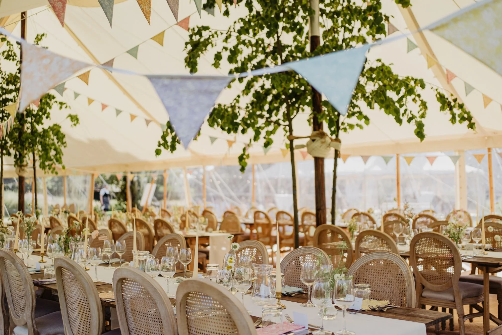 We added white linen runners to the rustic wooden tables, and gold accents through the candle holders. Timeless flowers in bud vases added the perfect pop of summer colour, complementing the napkins and bunting beautifully. We hired lime trees to sit against each internal marquee pole, bringing the garden inside. I spent the day before the wedding at the marquees to set up all of the styling items and the full tablescapes, and it was an honour to be trusted to bring Sarah and Will’s vision to life.