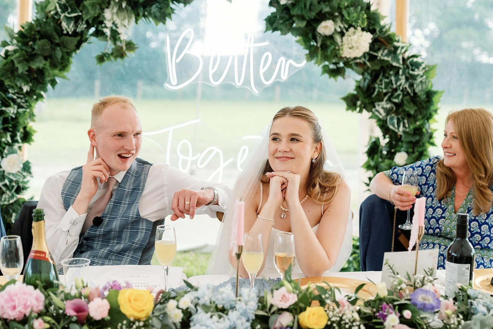 One of the most wonderful parts of Lucy and George’s day was their styling. They sourced all of their own décor items from scratch, from their incredible floral arch to their charger plates, creating a marquee that felt entirely personal. The day before the wedding, I was on site setting up the marquee, styling each table, placing each candle, and ensuring everything was in place. Lucy and George created the vision, while trusting me to turn it into reality for them!